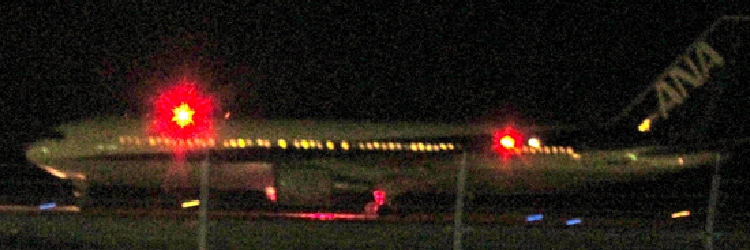 空港へは少し早く着いたので、受け取りの前に乗って来た飛行機を写そうと待っていたら早めに反対側の滑走路からゆっくり現れたANA669便、慌てて写真におさめるも真っ黒。